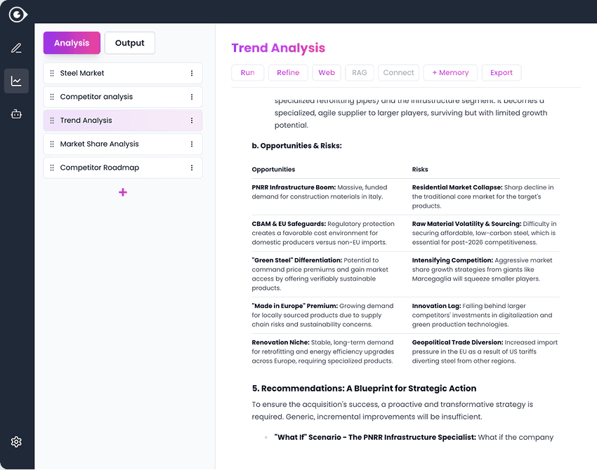 A smarter, service-led way to run strategy and innovation workstreams - across commercial, product, service, financial, operational, and value creation dimensions - without the slow timelines or heavy headcount.